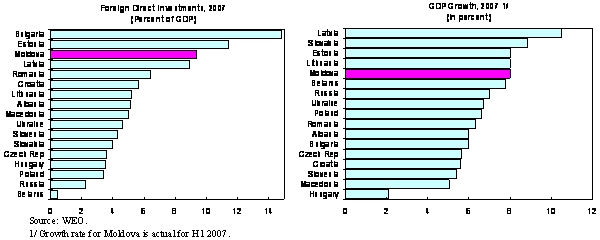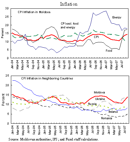 High inflation remains the main concern. Good progress by the National Bank of Moldova (NBM) in reducing inflation since late 2006 was set back by the drought, causing a spike in food prices, in line with regional trends. A renewed effort will be needed to ensure inflation is brought down to single digits in 2008. Also, fiscal policy will need to continue to withdraw fiscal stimulus and support disinflation efforts in early 2008. The current account is improving. Despite last year’s shocks, the current account deficit is projected to narrow to 9 percent of GDP, compared with 12 percent in 2006. While exports have grown, imports grew faster than expected, fuelled by robust remittances and stronger FDI. The deterioration in the merchandise trade balance has been offset by improvements in net income and transfers. Strong growth performance has presented new challenges.The current environment is favorable but fragile. Being late to transition, Moldova can benefit from the experience of other countries in the region. This has shown that smooth convergence will depend on a strong fiscal and monetary stance to bring inflation down quickly, and provide more policy flexibility when Moldova faces inevitably mounting capital inflows and appreciation pressures. While recent trends are similar to those faced by neighboring CEE countries, Moldova has fewer effective policy levers to address these pressures. The role of fiscal policy is limited due to Moldova’s low income and high development needs. At the same time, the ability of monetary policy to offset the impact of strong capital inflows and ensure disinflation is constrained by weak transmission channels and underdeveloped financial markets. Fiscal policy has been sound, but more needs to be done to improve efficiency.Government finances are healthy. The general government reported a surplus in the last four years owing to robust revenue from VAT and excises on imports, while expenditures were kept in line with budget commitments. Fiscal performance is also strong this year, with revenues driven by higher VAT on imports, and the fiscal targets under the program will be easily met. Fiscal policy will need to remain prudent to support the disinflation effort. The 2008 budget deficit target of 0.5 percent of GDP is appropriate, even though the budget has been squeezed by the reduction in corporate and personal income taxes. The focus of spending should be shifted from current spending to investment. The public sector wage bill is one of the highest in the region, despite low salaries, and some restructuring will be inevitable if the public sector is to be able to attract and retain high quality staff. Strong revenue prospects provide an opening for decisive reform of the public sector. This should focus—in line with recommendations of the World Bank’s 2006 Public Expenditure Review—on reducing the size of the public sector, especially in education, to allow for improved quality of service, higher education standards, and a pay structure that more closely aligns pay with skills. The ongoing World Bank Public Expenditure Review has identified the implementation of a transparent and uniform remuneration scheme and consolidation of school and health care networks as key reform areas to improve service quality. Timely implementation of the new targeted social assistance system in 2008 will be key to reduce poverty. The current system of social assistance based on social categories is poorly targeted. The new, means-testing system, whose methodology was adopted in early October (a slight delay relative to the end-September structural benchmark), promises to considerably improve targeting and should go a long way to mitigate higher energy costs for the poor. The burden for consolidating macroeconomic stability falls on monetary policy.Monetary policy bears the brunt of the disinflation effort. Strong appreciation pressures, and a weak transmission process complicate the task of the National Bank. Upside risks to inflation remain, despite the welcome recent monetary tightening, with possible second round effects from the drought. The year-end ceiling on reserve money under the PRGF is likely to be breached. Real interest rates on sterilization operations will need to remain substantially positive until monetary pressures are eased and further tightening may be needed to ensure disinflation is fully entrenched. The movement of the accounts of the Social Fund, the Health Fund, and territorial budgets from commercial banks to the treasury single account at the NBM by end-2007 should ease part of the liquidity pressures. Given growing inflows of foreign exchange, appreciation pressures are unavoidable. Fighting inflation should continue to be the central focus of monetary policy. While the strengthening of the real effective exchange rate may raise concerns about price competitiveness, it should be realized that the exchange rate is moving broadly in line with fundamentals. Appreciation pressures are the result of capital inflows reflecting high rates of return, and are a normal result of the convergence process, whereby incomes in Moldova will catch-up with those of its neighbors.